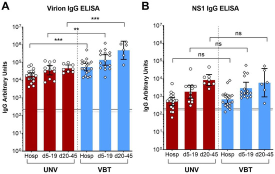 TBE virion- and NS1-specific IgG antibody responses of unvaccinated (UNV) and vaccination breakthrough (VBT) TBE patients in ELISA. (A) Virion-specific and (B) NS1-specific IgG antibody responses of TBE patients with and without prior vaccination, each group comprising 18 patients. Hosp represents samples obtained upon hospitalization. d5–19 and d20–45 are follow-up samples obtained 5 to 19 days and 20 to 45 days after the first serum, respectively. Data represent geometric means with 95% confidence intervals. The significance of changes in antibody concentrations between the two groups in the different time windows was determined by t-tests. ns, not significant; **, p < 0.01; ***, p < 0.001. Cut-off positive: solid line, cut-off equivocal: dashed line. Hosp, hospitalization; UNV, unvaccinated; VBT, vaccination breakthroughs.