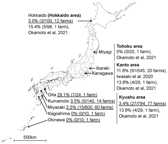 Map of Japan showing the positivity rate of bovine foamy virus (BFV) for each area. The map indicates the six prefectures (Hokkaido, Oita, Kumamoto, Miyazaki, Kagoshima and Okinawa) where sampling was performed in this study, and three prefectures (Miyagi, Ibaraki and Kanagawa) where sampling was performed in previous studies [18,19]. The BFV positivity rate is indicated by %, and the parentheses show the numbers of positive and tested samples and the number of tested farms in each prefecture and area. The surveys conducted by this study are indicated with underlines.