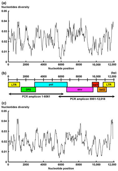 Finally, we performed sliding window analysis among the 36 full-genome sequences of BFV (Figure 2c). The most variable region was confirmed in the LTR region corresponding to positions 1037–1236 of the BFV Riems strain. Conversely, the most conserved region was confirmed in the pol region corresponding to positions 5749–5948 of the BFV Riems strain.