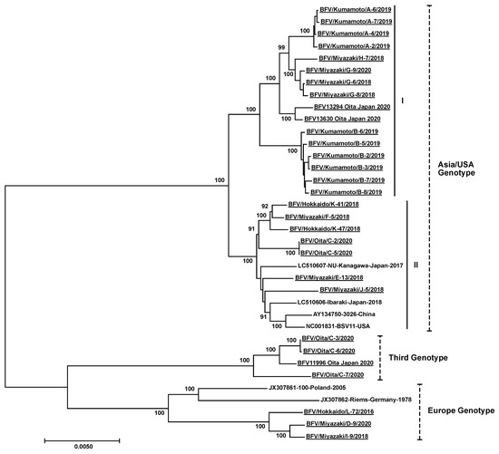 Phylogenetic analysis of the whole-genome sequences of bovine foamy virus (BFV). The analysis involved the whole-genome sequences of the 36 BFV isolates at the nucleotide level. The names of the 27 isolates for which the whole viral sequence was identified in this study are denoted as “BFV”, “isolation prefecture”, “name of isolate”, and “isolation year” separated by slashes and with underlines (e.g., BFV/Miyazaki/G-6/2018). Three isolates of the virus isolated in this study are named as “name of isolate”, “isolation prefecture”, “Japan”, and “isolation year” with underlines (e.g., BFV13294 Oita Japan 2020). The sequences retrieved from GenBank are denoted as “accession No.”, “name of strain”, “isolation (prefecture) country”, and “isolation year” separated by hyphens (e.g., LC150607-NU-Kanagawa-Japan-2017). Bootstrap values of more than 80% (1000 replicates) are shown next to the branches. The scale bar indicates the number of substitutions per site. The vertical broken and full bars show the classification of genotypes (Asia/USA, Third, and Europe) and clusters (I, II) of BFV, respectively.