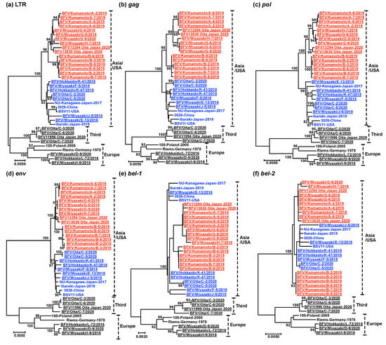 Phylogenetic analyses of the entire coding and noncoding genes of bovine foamy virus (BFV). Phylogenetic trees based on the entire LTR (a) and gag (b), pol (c), env (d), bel-1 (e), and bel-2 (f) genes. The 27 isolates for which the whole viral sequence was identified in this study are denoted as “BFV”, “isolation prefecture”, “name of isolate”, and “isolation year” separated by slashes and with underlines (e.g., BFV/Miyazaki/G-6/2018). Three isolates of the virus isolated in this study are denoted as “name of isolate”, “isolation prefecture”, “Japan”, and “isolation year” with underlines (e.g., BFV13294 Oita Japan 2020). The sequences retrieved from GenBank are denoted as “name of isolate”, “isolation (prefecture) country”, and “isolation year” with hyphens (e.g., NU-Kanagawa-Japan-2017). Bootstrap values of more than 80% (1000 replicates) are shown next to the branches. The scale bars indicate the number of substitutions per site. The vertical broken bars show the classification of genotypes (Asia/USA, Third, and Europe). The clusters (I, II) of BFV within the Asia/USA genotype are colored with red and blue font.