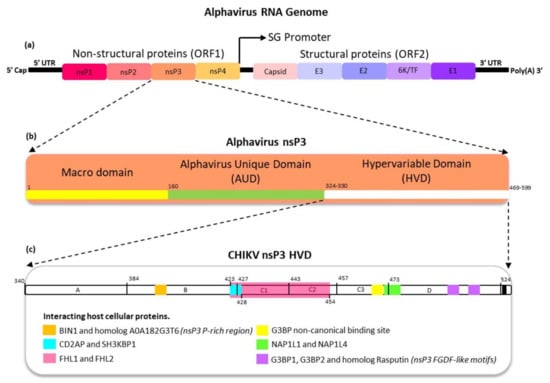 In addition, a previous study demonstrated the importance of the interaction between CHIKV nsP3 HVD and Rasputin, an Aedes albopictus cellular protein, for viral pathogenesis [108]. When the in vivo interaction was absent, the CHIKV infection rate and transmission in live Ae. albopictus, from its body (abdomen and thorax) to its head (saliva), significantly decreased.