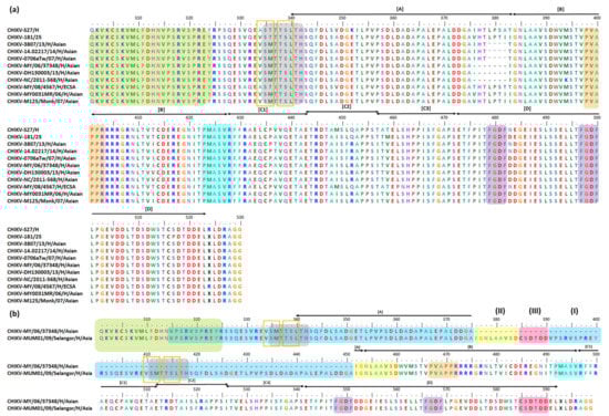 Interestingly, four human patient isolates (MY002IMR/06/BP (accession no: EU703759), MY003IMR/06/BP (accession no: EU703760), MY019IMR/06/BP (accession no: EU703761), and MY021IMR/06/BP (accession no: EU703762)) and four non-human primate isolate (M125 (accession no: KM923917), M127 (accession no: KM923918), M128 (accession no: KM923919), and M129 (accession no: KM923920)) which all were isolated from the outbreak in Bagan Panchor, Malaysia, in 2006 [241] were identified not to have any aa deletion in their nsP3 HVD [250].