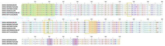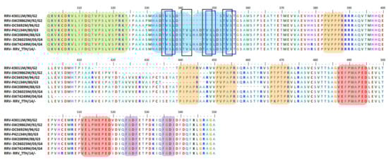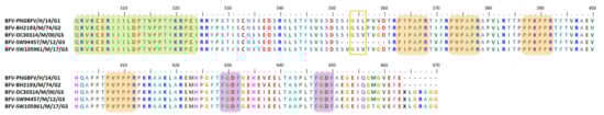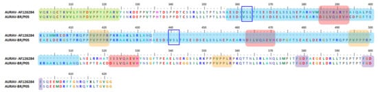 Isolated AURAV BR/P05 was found to have a high percentage of similarity in its genetic properties, at 92.9% for non-structural ORF and 96.6% for structural ORF compared to the previously reported AURAV isolate, AF126284. As shown in Figure 3, both AURAV strains have two P-rich regions at positions 416–421 and 553–558 (peach), as well as two FGDF-like motifs at positions 578–581 and 598–601 (purple). The only differences between both strains are (i) the 78 aa duplication motif and (ii) the substitution of the opal stop codon with arginine; both are unique characteristics present in the BR/P05 strain.