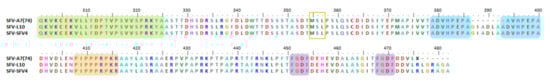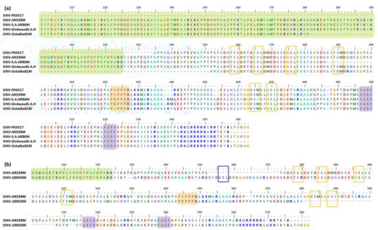 The nsP3 HVD can endure large aa deletions and insertions [3,16,127]. Here, we discuss a few selected mutation events observed in the nsP3 HVD of different alphavirus species for a better understanding of the characteristics and functions of these events. Alongside the description of these mutation events, we present the multiple sequences alignment (MSA) results for the studied alphaviruses. The motifs mentioned here are based on our own MSA analysis using various alphavirus strains selected from multiple studies. Thus, the motifs and aa positions might be slightly different from the motifs that we have discussed previously. However, the motifs here maintain the overall motif specificity characteristics and are heavily based on previous studies.