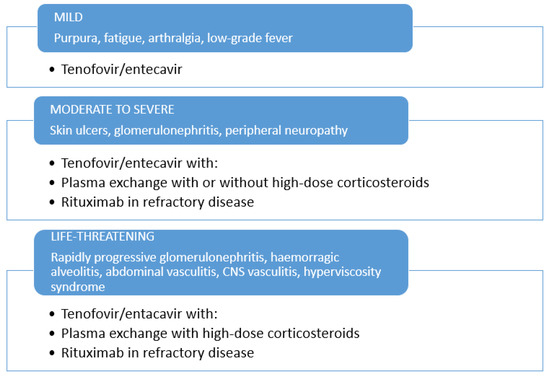 No specific treatment guidelines are currently available for patients with HBV-related CV and the best treatment has yet to be established. As demonstrated in HCV-related CV, direct antiviral agents are effective in a significant proportion of patients and usually introduced as the first-line treatment [66]. The literature reviews herein described, together with the original results we reported in a long-term follow-up of the largest series of patients treated with NAs, suggest that HBV replication is the triggering factor, and antiviral therapy may be the first-line treatment. The suppression of HBV replication is the goal to obtain CV remission, to prevent organ complications, and the possible evolution to lymphoproliferative disorders [67], which is a common neoplastic evolution in cryoglobulinemias, with possible underlying similar hyperactivated pathways and risk factors [68].