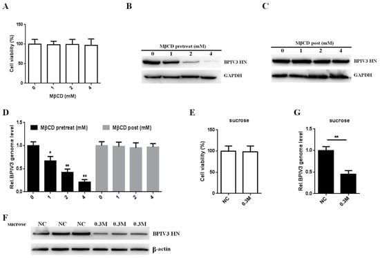 Effect of MβCD and hypertonic medium on BPIV3 infection. (A) The cytotoxicity of MβCD was determined by CCK-8 assays (0 vs. 1, p = 0.5743; 0 vs. 2, p = 0.6724; 0 vs. 4, p = 0.7215). (B) MβCD inhibited penetration of BPIV3. HeLa cells were preincubated with MβCD and infected with BPIV3 (MOI = 1). After the infected cells were incubated for 5 h, levels of BPIV3 HN were were determined by western blot. GAPDH served as the loading control. (C) MβCD had no effect on BPIV3 replication. HeLa cells preinoculated with BPIV3 (MOI = 1) for 1 h were treated with MβCD for 1 h. After the infected cells were incubated for 5 h, levels of BPIV3 HN were determined by western blot. GAPDH served as the loading control. (D) HeLa cells were pretreated or post-treated with MβCD and inoculated with BPIV3 (MOI = 1). After the infected cells were incubated for 2 h, the viral genome level was detected by RT-qPCR (for MβCD pretreated groups: 0 vs. 1, p = 0.014; 0 vs. 2, p = 0.0008; 0 vs. 4, p = 0.0002; for MβCD post-treated groups: 0 vs. 1, p = 0.7994; 0 vs. 2, p = 0.5654; 0 vs. 4, p = 0.6649). (E) The cytotoxicity of 0.3 M sucrose was determined by CCK-8 assays (p = 0.8601). (F) Hypertonic medium suppressed BPIV3 infection. HeLa cells were preincubated with medium containing either 0.3 M sucrose (hypertonic medium) or normal culture medium (NC) and infected with BPIV3 (MOI = 1). After the infected cells were incubated for 5 h, levels of BPIV3 HN were determined by western blot. β-actin served as the loading control. (G) Hypertonic medium inhibited BPIV3 entry. HeLa cells were pretreated with 0.3 M sucrose at the indicated concentrations and inoculated with BPIV3 (MOI = 1). After the infected cells were incubated for 2 h, the viral genome level was detected by RT-qPCR (p = 0.0015). The data are based on three independent experiments with at least three replicates for each. The data are shown as the means ± SD (** p < 0.01; * p < 0.05;).