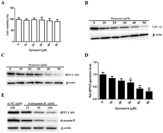 BPIV3 entry depends on dynamin. (A) The cytotoxicity of dynasore was determined by CCK-8 assays (0 vs. 10, p = 0.4780; 0 vs. 20, p = 0.7549; 0 vs. 30, p = 0.7295; 0 vs. 40, p = 0.3767; 0 vs. 50, p = 0.2053). (B,C) Dynasore inhibited VSV and BPIV3 infection. HeLa cells were pretreated with dynasore at the indicated concentrations and inoculated with VSV (MOI = 1) or BPIV3 (MOI = 1). After the infected cells were incubated for 4 h (for VSV) or 5 h (for BPIV3), levels of VSV G and BPIV3 HN were determined by western blot. β-actin served as the loading control. (D) HeLa cells were pretreated with dynasore at the indicated concentrations and inoculated with BPIV3 (MOI = 1) and incubated for 2 h. The viral genome level was determined by RT-qPCR (0 vs. 10, p = 0.4072; 0 vs. 20, p = 0.0823; 0 vs. 30, p = 0.0423; 0 vs. 40, p = 0.0076; 0 vs. 50, p = 0.0021). (E) HeLa cells transfected with the siRNA negative control (siNC) or increasing amounts of siRNA targeting dynamin II (si dynamin II) were inoculated with BPIV3 (MOI = 1) and incubated for 5 h, then the BPIV3 HN and dynamin II protein levels were determined by western blot. β-actin served as the loading control. The data are based on three independent experiments with at least three replicates for each. The data are displayed as the means ± SD (** p < 0.01; * p < 0.05;).
