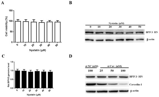 To investigate whether caveolae-mediated endocytosis pathways are involved in BPIV3 for entry, HeLa cells were first incubated with nystatin, a well-known caveolae-mediated endocytosis inhibitor. The toxicity of nystatin was determined, and as shown in Figure 4A, no cytotoxic effect was observed in HeLa cells. To test the efficacy of nystatin, the uptake of Alexa Fluor 555-labeled cholera toxin subunit B (CTB) was examined. As shown in Figure S1, the internalization of CTB was decreased in the cells pretreated with 20 to 50 µM nystatin. However, neither the BPIV3 HN protein nor the viral genome level was changed in the cells treated with different concentrations of nystatin (Figure 4B,C). These results were confirmed by siRNA knockdown of caveolin-1, which is crucial for the formation of stable caveolin-coated vesicles. Western blotting showed that the expression of caveolin-1 was decreased when cells were transfected with increasing concentrations of siRNA targeting caveolin-1. However, the expression of the BPIV3 HN protein in the different groups was not changed (Figure 4D). Taken together, these results demonstrated that the entry of BPIV3 into HeLa cells was caveolin-independent.