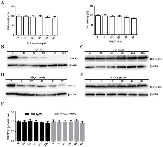 To define the role of pH in the viral invasion, we first investigated the effects of two acidification inhibitors, NH4Cl and chloroquine (CQ), on BPIV3 infection. Subtoxic doses of these inhibitors were determined by performing a cell viability assay. As shown in Figure 6A, no dose of the inhibitors used in this experiment had a cytotoxic effect on the HeLa cells. HeLa cells were preincubated with increasing concentrations of NH4Cl and chloroquine (CQ) for 1 h, followed by infection with BPIV3 at an MOI of 1. As shown in Figure 6C,E, neither NH4Cl nor CQ inhibited the expression of the BPIV3 HN protein, although both agents potently inhibited the entry of vesicular stomatitis virus, which required endosomal acidification for its fusion and entry (Figure 6B,D). These results were further confirmed by detecting the genome level of BPIV3 (Figure 6F). In accordance with previous results, there was no obvious elevation in the viral genome level in the cells treated with different concentrations of NH4Cl or CQ. Taken together, these results demonstrated that BPIV3 penetrated HeLa cells in a pH-independent manner.