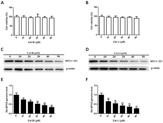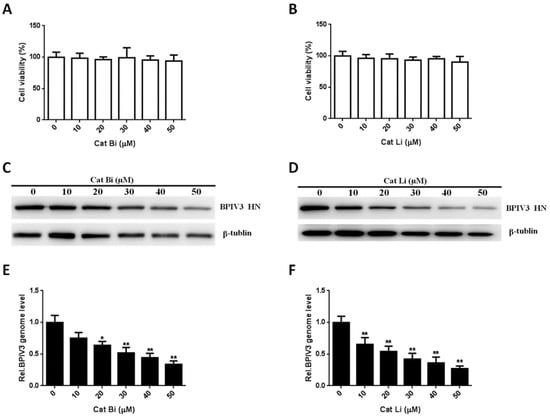 Entry of BPIV3 into HeLa cells requires cathepsin activity. (A,B) Cell viability upon Cat Bi or Cat Li treatment was determined, as described in the text. (C,D) HeLa cells were pretreated with Cat Bi or Cat Li at the indicated concentrations and inoculated with BPIV3 (MOI = 1). After the infected cells were incubated for 5 h, they were harvested and subjected to western blot analysis. (E,F) HeLa cells were pretreated with Cat Bi or Cat Li at the indicated concentrations and inoculated with BPIV3 (MOI = 1). The infected cells were incubated for 2 h, and the viral genome level was detected by RT-qPCR. The data are based on 3 independent experiments with at least three replicates for each. The data are displayed as the means± SD (** p < 0.01; * p < 0.05).