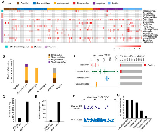For transcriptomics (poly-A tailed enrichment) sequencing data, we examined a total of 586 public transcriptomics libraries, which included 352 species of low vertebrate hosts, and detected members of Hepadnaviridae, Parvoviridae, Circoviridae, Herpesviridae, Polymaviridae, and Papillomaviridae. Among these, Hepadnaviridae had the highest positive rates (Figure 1G). The overall positive rate for DNA/RT viruses in the transcriptomics libraries was 4.1%.