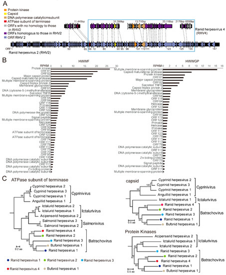 Genomic, transcriptomics, and phylogenetic analyses of the newly identified ranid herpesvirus 4. (A) Comparison of the genome structures of ranid herpesvirus 2 (RHV2, NC_008210.1) and RHV4. Genes are shown as rectangles with arrow tips showing the transcription direction, and those conserved in both viruses are connected with dotted lines. (B) Bar graph showing the expression levels of different genes by RHV4 in lung (HWWF) and liver/spleen (HWWGP) tissues. The horizontal axis represents the abundance of each gene as measured by RPKM. (C) The maximum likelihood phylogenetic trees based on the capsid maturational protease (capsid), ATPase subunit of terminase, and protein kinase proteins, respectively, showing the positions of RHV4 (solid red circle) within the diversity of the family Alloherpesviridae. Four amphibian-associated herpesviruses discovered previously are marked in different colors. All trees are midpoint rooted, and the taxonomy information is labelled to the right of each tree.