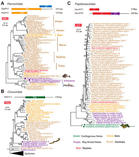 Genomic structures and evolutionary histories of novel small DNA viruses detected from metatranscriptomics and transcriptomics libraries. These include five potential new viruses from three families—namely (A) Parvoviridae, (B) Circoviridae, and (C) Papillomaviridae. The phylogenetic trees were reconstructed based on non-structural protein 1 (NS1), replicase protein, and L1 protein, respectively. All trees are midpoint rooted and scaled to the number amino acid substitutions per site. The virus names are color coded to reflect their host group. The positions of newly discovered viruses are shown in solid red circles in each tree and the host. Branch support values (>70%) are shown at the key nodes. All of the genomic structures are shown above the corresponding phylogenetic tree and the potential proteins or protein domains they encode are labeled in the predicted ORFs of these genomes.