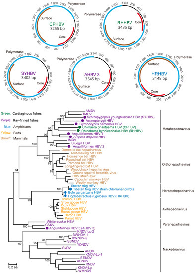 - Lauber, C.; Seitz, S.; Mattei, S.; Suh, A.; Beck, J.; Herstein, J.; Börold, J.; Salzburger, W.; Kaderali, L.; Briggs, J.A.G.; et al. Deciphering the Origin and Evolution of Hepatitis B Viruses by Means of a Family of Non-enveloped Fish Viruses. Cell Host Microbe 2017, 22, 387–399.e6. [Google Scholar] [CrossRef]