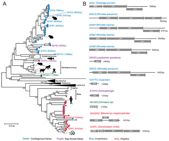 Our BLAST search also revealed a number of contigs carrying reverse transcriptase (RT), which were related to those from the family Retroviridae. These contigs were identified from a diverse range of hosts, including cartilaginous fishes (n = 2), ray-finned fishes (n = 2), amphibians (n = 46), and reptiles (n = 25), and some of them had been described in previous studies [47,48]. Despite their extensive diversity, the majority of the viruses discovered in this study had incomplete genomes or disrupted ORFs, so these were most likely expressed endogenous viruses [48]. Nevertheless, we did observe some contigs that contained the complete “gag–pol–env” gene set (Figure 5), and these might present as exogenous viruses, although it is unlikely to confirm based on current data whether these elements had viable viral particles.