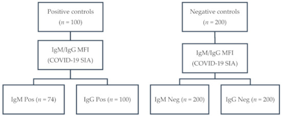 Flow diagram of sampling: IgG, immunoglobulin G; IgM, immunoglobulin M; MFI, median fluorescence intensity; COVID-19 SIA, Coronavirus disease 2019 suspension immunoassay; Pos, positive; Neg, negative.