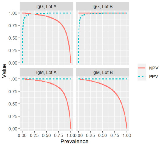 Effect of prevalence on the positive and negative predictive values (PPV; NPV) for two production lots (A and B) of a commercial rapid lateral flow point-of-care test, using the values for sensitivity and specificity presented in Table 3. IgG, immunoglobulin G; IgM, immunoglobulin M; Sens, sensitivity; Spec, specificity.