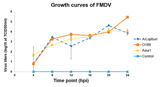 Growth kinetics of the FMDVs, including type A; A/Lopburi/2012, type O; O/TAI/189/1987, and type Asia1; Asia1/2013, were studied. Briefly, overnight seeded BHK-21 cells in 6-well plates were inoculated with each FMDV strain at a multiplicity of infection (MOI) of 0.01. Three replicates were included for each virus. After an hour of virus adsorption, the inoculum was then removed, and the cells were washed once with MEM and maintained in 2 mL of MEM containing 2% FBS. The infected cells were incubated at 37 °C with 5%CO2 for 24 h. The supernatants were collected at 6 different time points with 4-h intervals. The virus titers were calculated using the Reed and Muench method and reported as TCID50/mL.