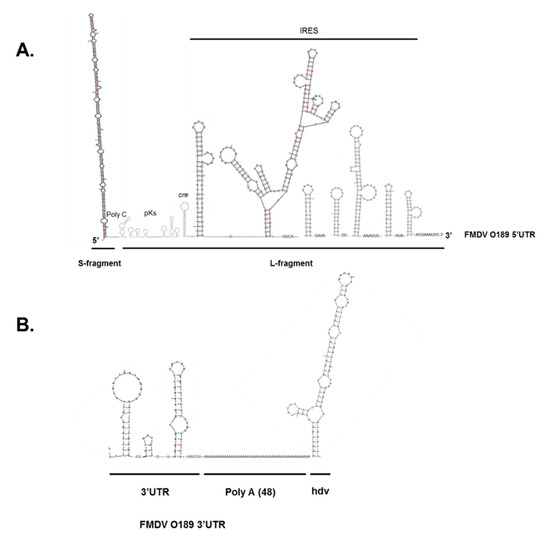 The regions of FMDV O189 UTRs and hdv ribozyme were used as the input sequences to generate the putative RNA secondary structures using mFold (RNA folding form version 2.3). (A) The 5′UTR comprised 368 nucleotides of S-fragment that formed a long stem–loop, followed by an l-fragment. The l-fragment was composed of 14 residues of a poly C, pseudoknots (pKs), cre, and IRES elements in a 5′ to 3′ direction. The pseudoknots spanned 175 nucleotides, while cre contained a conserve AAACA motif. The IRES spanned the rest of 5′UTR (located at 542–1053 nucleotides) upstream of the first start codon. (B) The 3′UTR contained 92 nucleotides folding into two stem–loop structures. Downstream the 3′UTR was a long poly A tail containing 48 adenine residues.