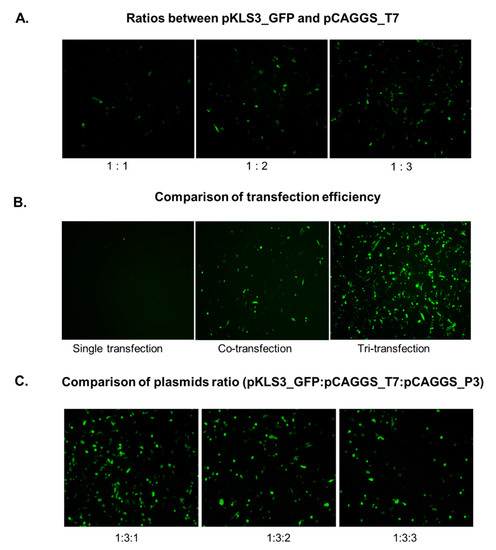 The plasmids pKLS3_GFP, pCAGGS T7, and pCAGGS_P3, were purified using a Mini-Prep purification kit (GeneMark, Taichung, Taiwan), following the manufacturer’s protocol. In the co-transfection experiment, the pKLS3_GFP and pCAGGS_T7 were transfected directly into BHK-21 cells, while pKLS3_GFP, pCAGGS_P3, and pCAGGS_T7 were combined in the tri-transfection protocol. The combinations of plasmids were incubated with Lipofectamine™ 2000 transfection reagent according to the manufacturer’s instruction (ThermoFisher Scientific, Waltham, MA, USA) prior to dropping onto overnight seeded BHK-21 cells in 6-well plates. The protocol for co-transfection was optimized by varying the ratio of pKLS3_GFP to pCAGGS_T7 as 1:1, 1:2, and 1:3. In the co-transfection experiment, 10 µL Lipofectamine™ 2000 were incubated in a 250 µL Opti-MEM® I reduced-serum medium (Invitrogen, Waltham, MA, USA) at room temperature for 5 min. Simultaneously, 1 µg of pKLS3_GFP and 1–3 µg of pCAGGS_T7 were equilibrated in 250 µL Opti-MEM® I reduced-serum medium.