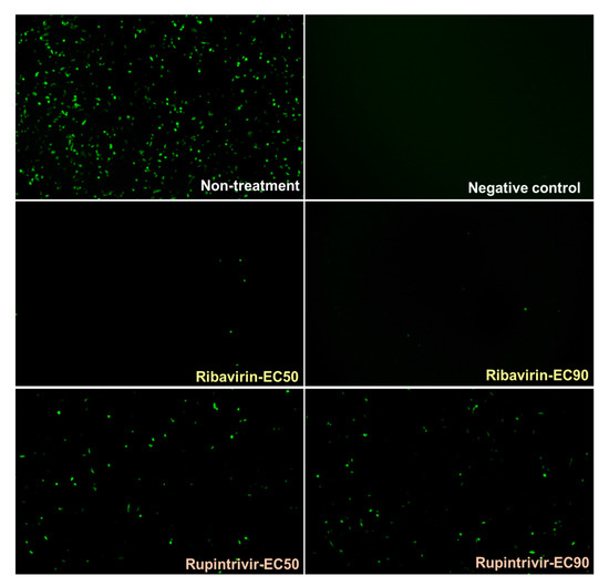 The previous results showed that pCAGGS_T7 and pCAGGS_P3 could function in trans on the pKLS3 minigenome to drive transcription of the GFP gene. We then examined the application of this minigenome for antiviral drug screening. Ribavirin is a synthetic purine nucleoside (guanosine) analog with a broad-spectrum antiviral activity. It is effective against a large panel of RNA viruses, including picornaviruses, such as poliovirus, FMDV, and enterovirus 71. Inhibition of viral infection occurs through a direct interaction between RdRp and ribavirin-5′-triphosphate. The misincorporation of ribavirin into the viral genome results in increased viral mutation rates, leading to the extinction of the virus population [39]. In this study, the effect of ribavirin to inhibit the function of RdRp in the pKLS3 minigenome system was determined. In addition, we also investigated whether a non-RdRp inhibitor, rupintrivir, would influence our pKLS3_GFP minigenome system. Rupintrivir is a synthetic compound targeting the 3Cpro of picornaviruses, such as enterovirus 71 and human rhinovirus [40]. BHK-21 cells transfected with pKLS3_GFP, pCAGGS_T7, and pCAGGS_P3 were treated with either low (EC50) or high (EC90) doses of either ribavirin or rupintrivir. The cytotoxic effect of the tested antiviral compounds on BHK-21 cells was also determined, and the 50% cytotoxicity concentration (CC50) of ribavirin and rupintrivir were higher than 500 µM [35]. Thus, the drug concentrations used in this study had no impact on cell viability.