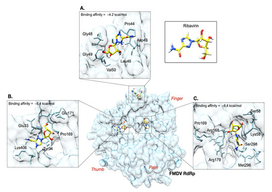 The model of FMDV O189 RdRp was developed, and the quality of the structural modeling was adequate for the molecular docking analysis to confirm whether ribavirin could bind to the active site on RdRp of FMDV. The amino acid sequence identity between the reference and O189 RdRp was 98.94%. The structural quality determined by QMEAN was scored at −0.86, while the Ramachandran plot was favored at 94.23%. The results of randomized docking showed that the ribavirin molecule preferentially buried in the pocket containing the residues Pro169 and Met296 with a binding affinity of −5.4 and −6.4 kcal/mol, respectively (Figure 7). The residues Pro44, Pro169, and Met296, were selected as specific docking targets according to the previous study [38]. In their study, M296I, P44S, and P169S substitutions were observed in the viral populations after being consecutively passaged in the media with ribavirin. For specific docking, ribavirin mainly reacted to Pro44 via π-sigma (−4.2 kcal/mol) and Pro169 via van der Waals (−5.4 kcal/mol) interactions. The possible interlinkages and binding affinities of ribavirin on FMDV O189 RdRp are depicted in Figure 7.