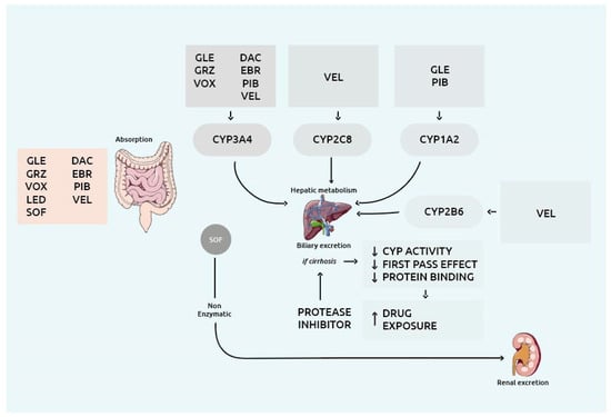 Patients with decompensated (Child-Pugh B or C) HCV-related cirrhosis have always been considered a difficult-to-treat cohort for which treatment options were limited and only liver transplantation could represent a definitive cure [11]. Due to the substantially elevated drug exposure and liver injury associated with NS3/4A PI, PI-containing regimens are not allowed in HCV patients with current or past decompensated cirrhosis [12]. Occurrence of liver failure or death due to the use of NS3/4A PI has been reported, and in 2019 the Food and Drug Administration (FDA) raised a safety warning about PI-containing regimens in these patients [13]. Figure 1 summarizes metabolism and distribution of the several available DAA.