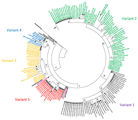 To better understand the molecular epidemiology of circulating strains in Tunisia, the 77 VP1-2A junctions detected in this work (2013–2018) were aligned with 104 previously published Tunisian strains of genotype IA collected during 2001–2013 period (Figure 2). The 104 sequences were selected among a total of 187 sequences published in Genbank. For identical sequences detected in the same year, only one representative sequence was selected for the phylogenetic analysis. Similar to Figure 1, the tree in Figure 2 shows the presence of at least five different variants that circulated in Tunisia between 2001 and 2018. A major variant (Variant 2) comprised strains that circulated in different regions of the country from 2001 to 2018. Variants 1, 3, 4 and 5 included sequences that were detected during somewhat shorter periods in 2007–2018, 2001–2015, 2012–2018 and 2014–2018, respectively.