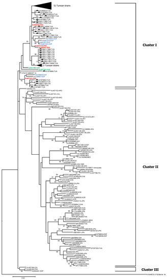 The phylogenetic comparison of the entire VP1 of HAV Tunisian strains with others published from 21 different countries of the world is shown in Figure 3. Based on the entire HAV VP1 sequence, the phylogenetic analysis shows the presence of three main clusters I to III. All the Tunisian sequences were grouped in one cluster (Cluster I) with sequences from France (4 sequences, represented in red), Spain (6 sequences, represented in blue) and Yugoslavia (2 sequences, represented in green). Cluster II enclosed sequences almost from all the different countries whereas the cluster III grouped only one sequence from Chile, one from France and one from Spain (Figure 3).