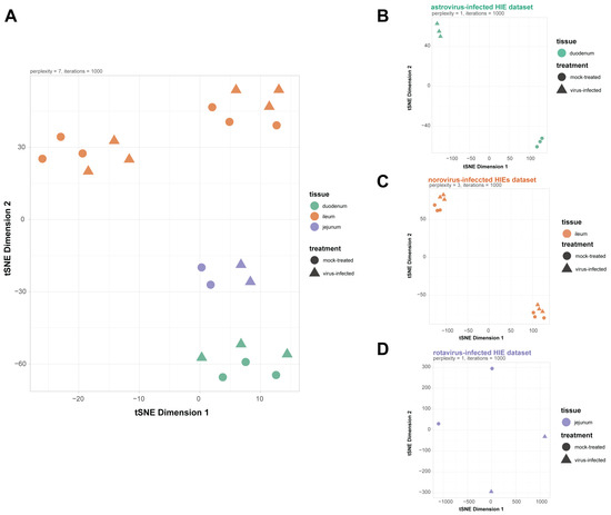 Samples across the three datasets showed divergence due to tissue origin of the HIE line but due to viral infection when looking at each dataset individually. Nonlinear dimensionality reduction with t-SNE of the 16 samples belonging to the three datasets were analyzed. Samples are colored by the segment of the small intestine that was used to derive HIE and each one of the datasets corresponds to a different small intestinal segment (duodenum, ileum and jejunum). The t-SNE plot shows that clustering is primarily driven by the tissue origin of HIE (A). Nonlinear dimensionality reduction with t-SNE for each individual dataset (6, 12 and 4 samples for astrovirus-infected (B), norovirus-infected (C), and rotavirus-infected (D) HIEs datasets, respectively) shows clustering of samples due to treatment (mock-treated versus virus-infected) as well as the HIE line since in the norovirus-infected and rotavirus-infected HIE datasets more than one HIE line were used. Plots were generated with Rtsne and perplexity values were chosen for each plot after stability.