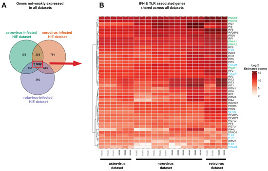 A large degree of overlap of non-weakly expressed genes is observed across all datasets. Estimated gene count matrices for each RNA-seq dataset were filtered to remove genes with low constant expression levels (non-weakly expressed) with the package HTSFilter in R. Log transformed estimated counts for selected genes associated with IFN and Toll-like receptor signaling are shown. (A) A total of 11,262 shared genes were identified in the three RNA-seq datasets, and the norovirus-infected ileal HIEs contained the largest number of genes identified in a single dataset. (B) Genes detected in all three datasets and annotated in the Entrez Molecular Sequence Database System as part of the IFN response or involved in Toll-like receptor signaling are shown. Each column shows individual replicates (mock-treated samples in grey and virus-infected samples in black) for each study. Highlighted in green are genes coding for IFN or IFN receptors, while genes associated with Toll-like receptor signaling are in blue.