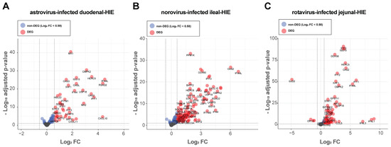 Differential expression analysis in HIEs infected with astrovirus, norovirus and rotavirus. Differentially expressed genes (DEGs) for the three re-analyzed RNA-seq datasets are shown. DEGs with Log2 fold-change (FC) > 0.58 when compared to mock-treated samples and an FDR of less than 1% are shown red, while genes with an FDR of less than 1% (adjusted p-value < 0.01) that were below the Log2 FC threshold are shown in blue. FDR was calculated using an Empirical Bayes (EB) approach with the R package ashr. DEGs were identified in astrovirus-infected duodenal-HIEs (A), norovirus-infected ileal-HIEs (B) and rotavirus-infected jejunal-HIEs (C) using the package DESeq2 and plotted using the package EnhanceVolcano in R.
