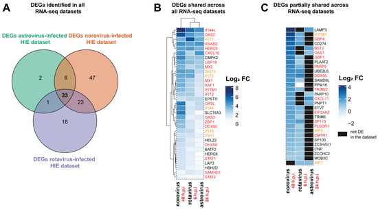 In the astrovirus-infected duodenal HIE dataset, 42 DEGs were identified out of a total of 11,824 non-weakly expressed genes, the smallest number of DEGs of the three RNA-seq datasets analyzed and all were up-regulated genes (Figure 3A). When re-analyzing the norovirus-infected ileal-HIEs dataset, we evaluated the sequencing data from both HIE lines (TI006 and TI365) together to explore universal patterns of host-response against norovirus GII.4. Additionally, sequencing data for both HIE lines were generated within the same institution for the same study and both HIE lines were grown from ileal biopsies. We found that of a total of 12,917 non-weakly expressed genes, 109 were DEGs, which were all up-regulated (Figure 3B). Finally, in the RNA-seq dataset generated from rotavirus-infected jejunal HIEs, two jejunal HIE lines (J2 and J11) were used. In this study, out of a total of 12,416 non-weakly expressed genes, 75 were DEGs with 71 up-regulated and 4 down-regulated genes (Figure 3C).