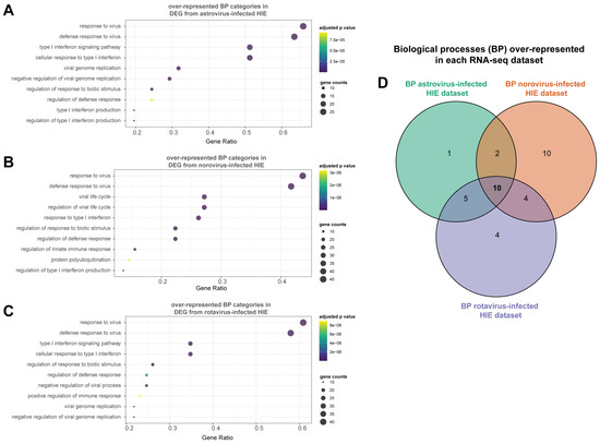 In addition to specific genes, we also wanted to explore which biological processes were over-represented in the list of DEGs identified in each RNA-seq dataset. Towards that end, we performed a gene ontology (GO) over-representation analysis comparing biological processes (BP). The dot plots highlight the top ten over-represented biological process (BP) categories identified in the list of DEGs for each dataset (Figure 5A–C). 18, 26 and 23 over-represented BP categories were found in astrovirus-infected, norovirus-infected and rotavirus-infected HIEs, respectively, using a FDR cutoff of 0.1% (adjusted p value < 0.001) with the Benjamini–Hochberg (BH) step-up procedure (Table 3). Ten over-represented BP categories were shared across all RNA-seq datasets (Figure 5D). The top two over-represented BP categories were the same in all three datasets (“response to virus” [GO:0009615] and “defense response to virus” [GO:0051607]) with a gene ratio between 0.4 and 0.6, showing that close to half of the DEG identified for each dataset fall into these two categories independently of the infecting virus. The next group of over-represented BP categories contained processes associated with a type I IFN response (“regulation of type I interferon production” [GO:0032479] and “type I interferon production” [GO:0032606]) with gene ratios close to 0.2. The total number of over-represented BP categories was similar across the three RNA-seq datasets, even though the number of DEGs identified in the astrovirus-infected duodenal-HIEs was much lower than in the other two datasets (Table 3).
