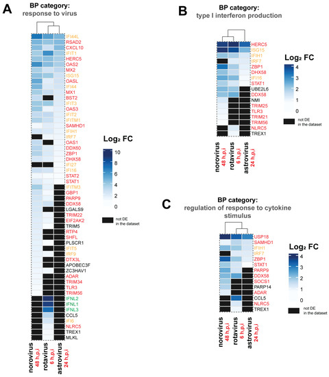 DEG expression patterns in shared over-represented biological processes (BP) in the three RNA-seq datasets after gene ontology (GO) over-representation analysis. Heatmap-like functional classification displays in which differentially expressed genes (DEGs) were assigned to the BP categories “response to virus” (A), “type I interferon production” (B) and “regulation of response to cytokine stimulus” (C). For each dataset, genes that were not differentially expressed for the indicated RNA-seq dataset are indicated in grey. Genes annotated in the Entrez Molecular Sequence Database System as part of IFN responses are highlighted in red. Genes with a symbol containing IFI (IFN-inducible) or ISG (IFN-stimulated genes) are in orange, while genes coding for IFN proteins are in green. Log2 fold-change (FC) values within the range of each dataset are shown. Over-represented BP categories were identified with the package clusterProfiler and heatmaps generated with the package ComplexHeatmap in R. The sampling time point in hours post-infection (h.p.i) at which each RNA-seq dataset was generated is indicated.
