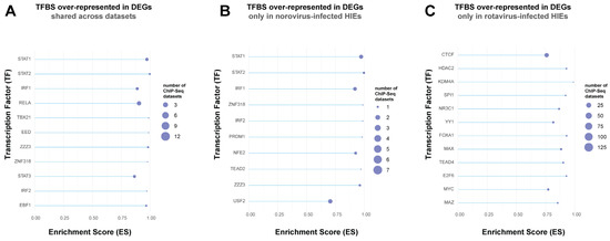 Transcription factor binding site (TFBS) analysis of differentially expressed gene sets (DEGs). Displayed are the enriched TFBS present in the list of 63 DEGs that were shared or partially shared across the three RNA-seq datasets (astrovirus, norovirus and rotavirus-infected HIEs) (A), the 47 DEGs only identified in norovirus-infected HIEs (B), and the 18 DEGs only identified in rotavirus-infected HIEs (C). Enrichment Score (ES) values are displayed for each transcription factor (TF) reflecting the degree to which a TF is significantly enriched (FDR-adjusted p value < 0.05) in the subset of DEGs as well as the number of ChIP-seq datasets used in the analysis of the TF. Transcription factor enrichment analysis (TFEA) was performed with the package TFEA.ChIP in R.