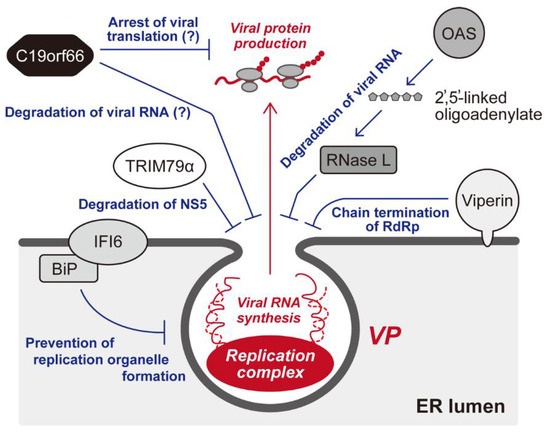 The process of the replication complex formation requires many viral and cellular factors [10]. For instance, some trans-membrane NS proteins function as the scaffold to retain the replication complex to ER. Among them, NS2B serves as a cofactor of NS3 protease activity [5]. Additionally, DNAJC14, a cellular protein chaperone, is shown to facilitate the viral protein processing step, resulting in the formation of a functional replication complex [10,11]. Of particular interest is that the intracellular membrane structure within the ER is rearranged by a virus infection, which is closely associated with the activity of the flaviviral replication complex, including viral RNA amplification and protein translation [12,13,14,15,16,17,18,19,20]. The establishment of this membranous microenvironment is thought to be necessary to promote flavivirus replication. Additionally, this architecture wrapped by the ER membrane is presumed to contribute to the protection of the viral replication machinery from cellular immune defense systems [21,22,23,24]. In this review, we will focus our attention on the biogenesis and regulation of the flavivirus-induced organelle-like membranous structures by viral and cellular factors.