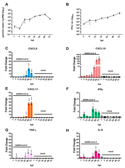 Pro-inflammatory chemokine/cytokine production by Calu-3 cells in response to severe acute respiratory syndrome coronavirus 2 (SARS-CoV-2) infection of Calu-3 cells. Calu-3 cells were infected with SARS-CoV-2 (MOI 1). At 1, 3, 9, 12, 18, 24, 48 and 72 h post-infection (hpi), total cell lysates were collected and subjected to RNA isolation. Supernatants were collected in parallel for viral plaque assays. (A) The SARS-CoV-2 viral genome copies detected by RT-qPCR (n = 4). (B) Viral plaque assays were conducted and PFU/mL calculated (n = 4). Host transcriptional-targets were detected by RT-qPCR: (C) CXCL9, (D) CXCL10, (E) CXCL11, (F) IFNγ, (G) TNFα, and (H) IL-6. Transcript levels are expressed as fold change as compared to the respective mock-infected control and represent the mean ± SEM (n = 4). Significance was determined using the Student’s t-test; * p < 0.05, ** p < 0.001, *** p < 0.0001.