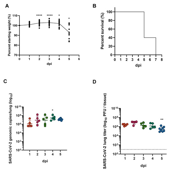 SARS-CoV-2 causes fatal disease in hACE2 mice and replicates in the lungs. Female hACE2 mice were intranasally exposed to 1 × 105 PFU of SARS-CoV-2. Mice were followed for survival and sacrificed at 1, 2, 3, 4 and 5 dpi. Lung homogenates were prepared from infected mice for RNA isolation and RT-qPCR. (A) Percent of starting weight over time for all infected mice. (B) Kaplan–Meier survival curve of hACE mice infected with SARS-CoV-2 (n = 5). (C) SARS-CoV-2 viral genomic copies measured over time within the lungs by RT-qPCR. Mean copy number (log10) ± SEM is shown (n = 5 per time point, except 5 dpi n = 8). (D) SARS-CoV-2 viral titer within the lungs as determined via plaque assays. Mean titer (log10) ± SEM is shown (n = 5 per time point, except 5 dpi n = 8). Statistical significance was determined using one-way ANOVA with Dunnett’s post-hoc analysis with significance relevant to 0 dpi (panel A) or 1 dpi (panels C and D). * p < 0.05, ** p < 0.01, and **** p < 0.0001.