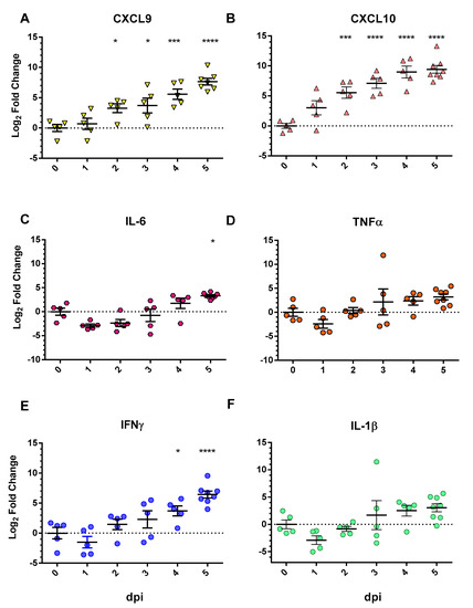 To assess the expression of pro-inflammatory chemokine and cytokine genes in SARS-CoV-2-infected mice, transcript levels for CXCL9, CXCL10, IL-6, TNFα, IFNγ, and IL-1β were measured from the lungs of serially sacrificed animals by RT-qPCR. CXCL11 gene expression was not assessed due to it not being expressed in C57BL/6 mice [30]. CXCL9 and CXCL10 mRNA levels were significantly elevated at 2–5 dpi (Figure 3A,B). While there is variability in CXCL9 and CXCL10 gene expression among animals, there is an evident trend towards upregulation of transcripts over time with large increases in transcript level elevation at days 2–5 with increasing statistical significance when compared to uninfected (0 dpi). IL-6 levels were significantly increased at 5 dpi with overall time-dependent elevation in IL-6 transcripts (Figure 3E); TNFα levels, while not statistically significant, showed a trend of upregulation over time (Figure 3D). It is also interesting to note the magnitude of the changes, with CXCL10 levels being on average 5–10× higher than CXCL9 and IL-6 levels and over 50X higher than TNFα mRNA levels. IFNγ transcript levels were trending upward over time with statistically significant increases observed from 4–5 dpi (Figure 3E). The expression of IL-1β, another inducer of CXCL10 gene transcription, was similarly lower in magnitude as compared to the CXC’s, and while transcript levels increased over time, was not deemed to be statistically significant (Figure 3F) [31].