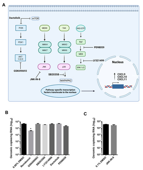 Kinase inhibitors targeting intracellular signaling-pathways that regulate CXCL9, CXCL10, and/or CXCL11 transcription do not affect SARS-CoV-2 RNA production. Created with BioRender.com. (A) Inhibitors of the pathways referenced, PI3K/AKT, JNK, p38 MAPK, and ERK/MEK were utilized to study chemokine transcriptional modulation. (B) Calu-3 cells were pretreated for 1 h with the indicated kinase inhibitor at nontoxic concentrations: Remdesivir (1 µM) control, GSK690693 (50 µM), SB203580 (25 µM), Dactolisib (10 nM), LY3214996 (100 nM), PD98059 (100 µM), and (C) JNK-IN-8 (5 µM). Cells were then infected with SARS-CoV-2 (MOI 1) and post-treated with the same inhibitor. Cell lysates were collected at 48 hpi and subjected to RNA isolation and RT-qPCR for the detection of SARS-CoV-2 intracellular RNA levels. Mean copy number (log10) ± SEM is shown (n = 3 per time point). Significance was determined using the Student’s t-test; * p < 0.05.