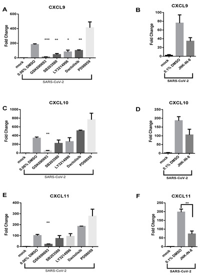 To assess the effects of kinase inhibitors on chemokine/cytokine induction and SARS-CoV-2 infection/replication, Calu-3 cells were seeded into 12-well cell culture plates at 5 × 105 cells/well. Following attachment, cells were pretreated for 1 h with inhibitors. After pretreatment, cells were infected with SARS-CoV-2 (MOI 1) for 1 h. Following initial infection, cells were washed, and were post-treated with the same inhibitor. Cell lysates were collected at 48 hpi and subjected to RNA extraction and RT-qPCR analysis as described above.
