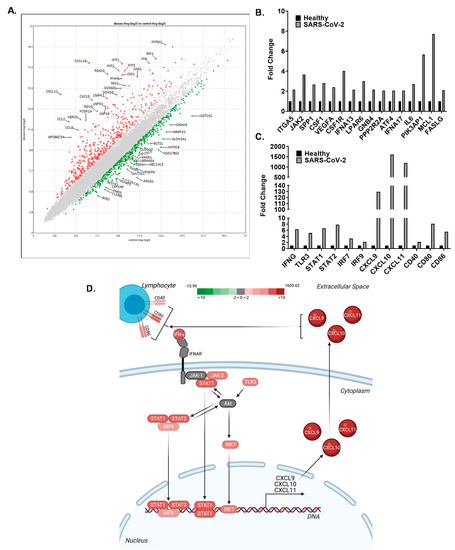 Transcriptomic analysis comparing human subjects that were positive for SARS-CoV-2 with subjects that had no detectable levels of the virus (controls) at the time of testing revealed significant changes in a wide range of genes. In general, the findings were consistent with other similar studies already published, including an inverse relationship between type-I interferon production (decreased) and cytokine/chemokine signaling (increased) [36]. A scatterplot analysis of the individual genes found to be significantly upregulated or downregulated in the SARS-CoV-2 subjects compared to the controls was generated and analyzed (Figure 6A). The top 25 genes upregulated (red) and downregulated (green) are labeled (Figure 6A). Consistent with the data discussed throughout this manuscript, the largest increases were observed in CXCL10 (1606 fold increase), CXCL11 (1192 fold increase), and CXCL9 (129 fold increase) in the SARS-CoV-2 infected individuals (Figure 6A,C). Pathway analysis assessments of the transcriptomics data revealed a significant increase in AKT signaling, associated with the significant upregulation of 16 key components of this signaling pathway (Figure 6B). While AKT itself was not significantly altered following SARS-CoV-2 infection, significant changes in these pathway components indicate that signaling associated with AKT is significantly increased. Pathway analysis further predicted that the increase in CXCL9, CXCL10, and CXCL11 in the human subjects was associated with increased IFNγ and TLR3 signaling (Figure 6C,D). Downstream from these signaling hubs, STAT1, STAT2, IRF9, and IRF7 are significantly upregulated and were identified as key transcription factors associated with CXCL9, CXCL10, and CXCL11 following SARS-CoV-2 infection (Figure 6C,D). Pathway analysis further suggests that the increased chemokine signaling is associated with increased CD40, CD80, and CD86 signaling that was also upregulated in the human subjects following SARS-CoV-2 (Figure 6C,D).