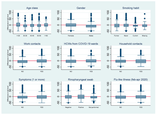 Among individuals who tested positive or equivocal at the first phase of the study, 616/696 (88.5%) and 36/42 (85.7%) of CSS and UNITO, respectively, adhered to be retested. After a median of 5.2 months (IQR 4.66–5.75), 85.3% of previously positive subjects tested positive again, and 4.1% became equivocal; among those sero-reverted (10.6%), mostly (57/68) still had an antibody level between 3.80 e 11.99 AU/mL, whereas only 1.7% were below the threshold (<3.8) (Figure 1). Comparable results were found, limiting the analysis to CSS workers only (data not shown). We did not observe significant differences in the absolute change in IgG levels between the two time points (with an overall median decrease of about–5AU/mL) in relation to demographic, clinical, and occupational features, with the exception of a larger reduction among men (Figure 2).