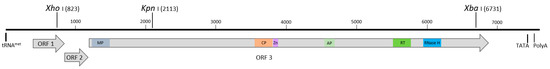 Linearized schematic representation of the genome organization of the BSCAV-Brisbane complete genome sequence. Block arrows represent the three open reading frames (ORFs) predicted from sequence analysis. Conserved protein motifs present in ORF 3 are indicated in color including the movement protein (MP, dark grey), coat protein (CP, orange), zinc finger domain (Zn, purple), aspartate proteinase (AP, light green), reverse transcriptase (RT, dark green) and ribonuclease H (blue). Additional genomic features highlighted include the conserved transfer RNA methionine (tRNAmet) complementary sequence denoting the start of the viral genome, and the putative TATA and polyA sequences predicted from sequence analysis. The location of the three unique restriction sites XhoI, KpnI and XbaI used for construction of the infectious clone is also shown.