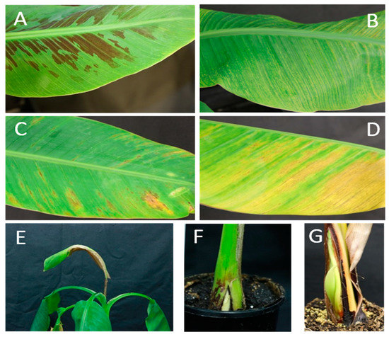 Inoculation of Musa acuminata bananas with pOPT-EBX-BSCAV. (A) Williams (Cavendish-AAA) leaf at 8 weeks showing typical mild flecking symptoms. (B) Pisang Madu (Musa AA subgroup) leaf at 8 weeks showing chlorotic streaking. (C) Truncata (M. acuminata subsp. Truncata (AA)) and (D) Igisahira Gisanzwe (Musa AAA-East African Highland Banana subgroup) leaves at 8 weeks showing chlorotic and necrotic areas. (E,F) Khae Phrae (M. acuminata AA subsp. siamea) plants at 16 weeks showing cigar leaf necrosis and pseudostem splitting. (G) Igisahira Gisanzwe plant at 28 weeks showing abnormal pseudostem growth/splitting.