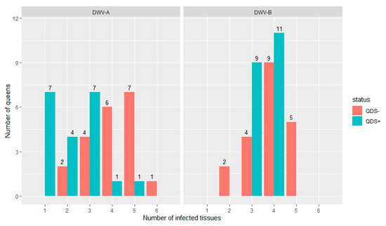 All queens were infected in at least one tissue for both DWV-A and DWV-B. Figure 1 shows the distribution of the number of infected tissues in each individual queen for both DWV-A and DWV-B and for QDS– and QDS+. The average number of infected tissues is significantly lower for QDS+ (2.2) compared to the QDS– (4.0) for DWV-A (Independent sample t-test t(237.74) = 4.85, p < 0.01).