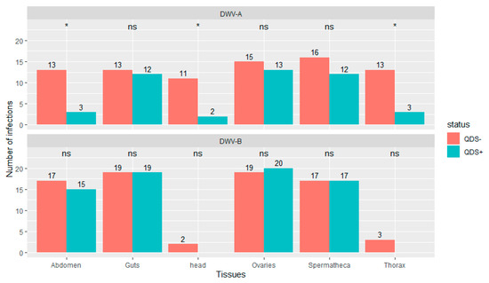 Number of tissues infected with DWV-A or DWV-B. Data is presented for QDS+ (green) and QDS– (red). Each group consists of 20 dissected queens. Significant differences between both groups are indicated at the top of each tissue with *, non-significant differences with ns.