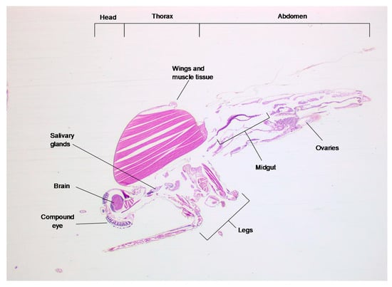 To visualize virus infection within the tissues of Culex pipiens, mosquitoes (in groups of five) were fed a blood meal containing RVFV strain ZH501 and maintained for 7 days at 25 °C. Each mosquito was then fixed in formalin, and preliminary sections were stained with haematoxylin and eosin (Figure 1) to identify key structures.